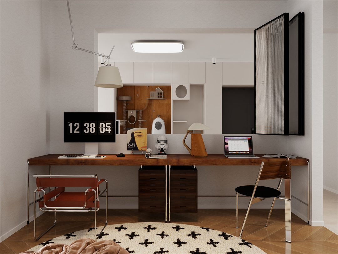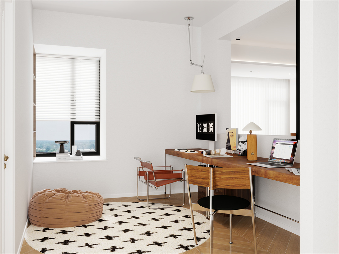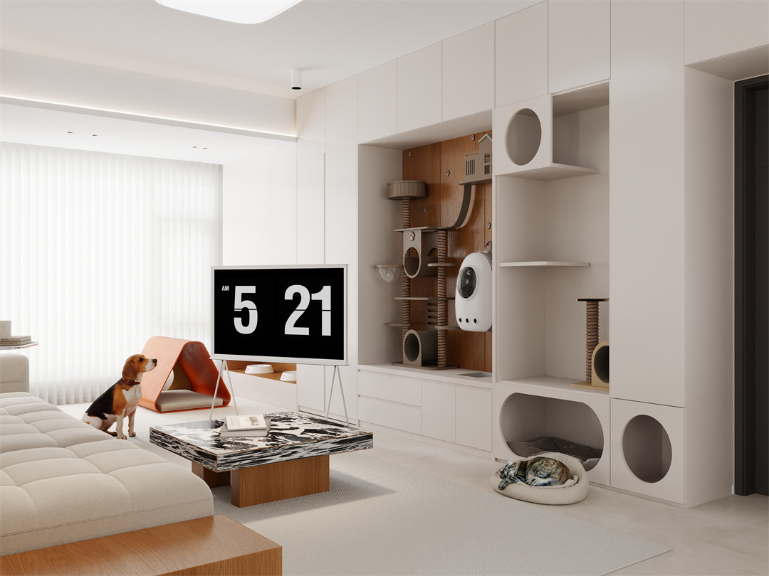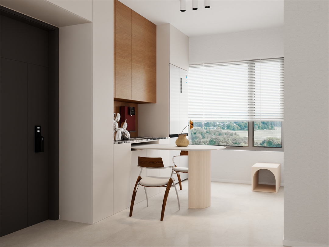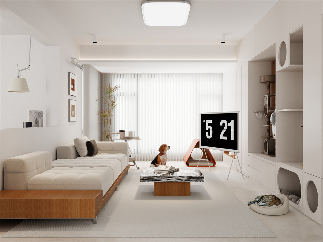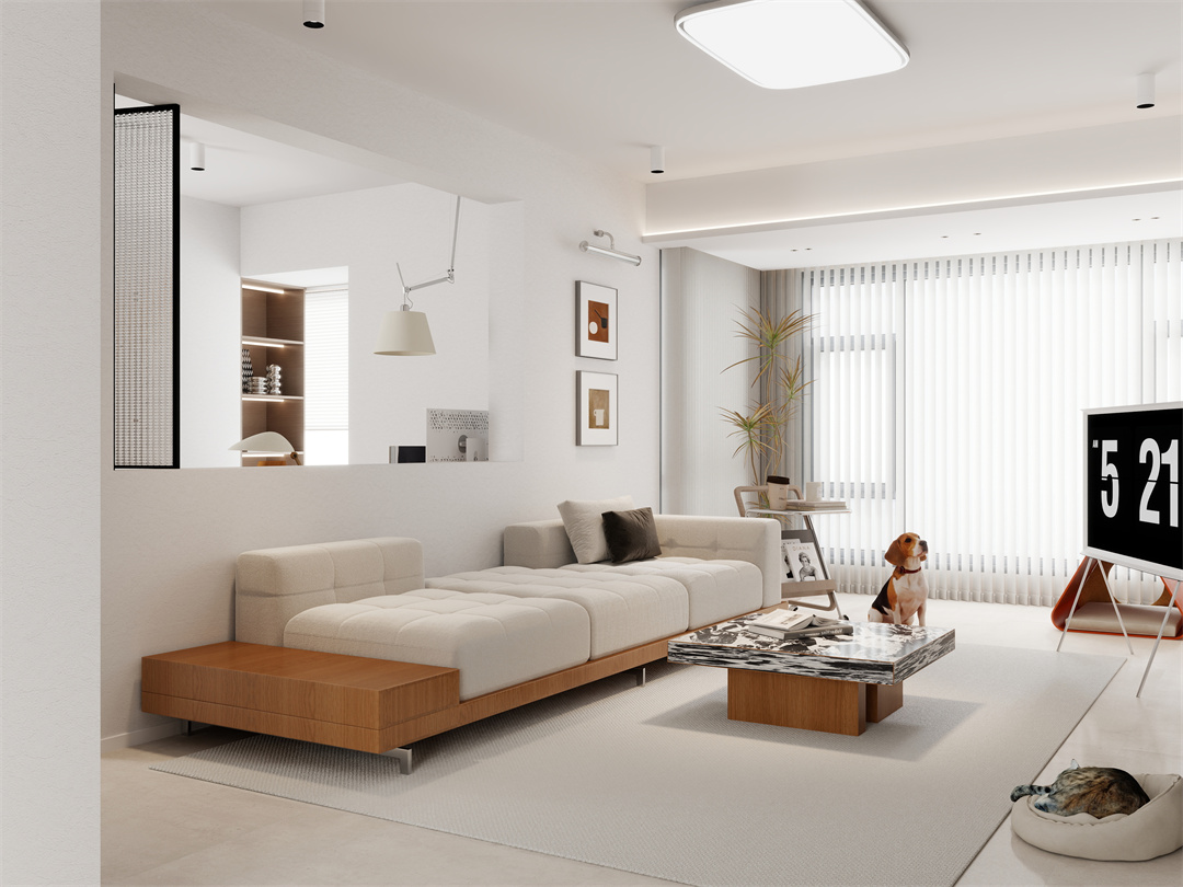 • 整體以白色為主色調,營造出簡潔、明亮且通透的視覺效果。客廳區域,淺米色的沙發搭配木質元素,在簡約中增添了溫暖質感。大理石紋理的茶幾,為空間注入一絲精致與高級感