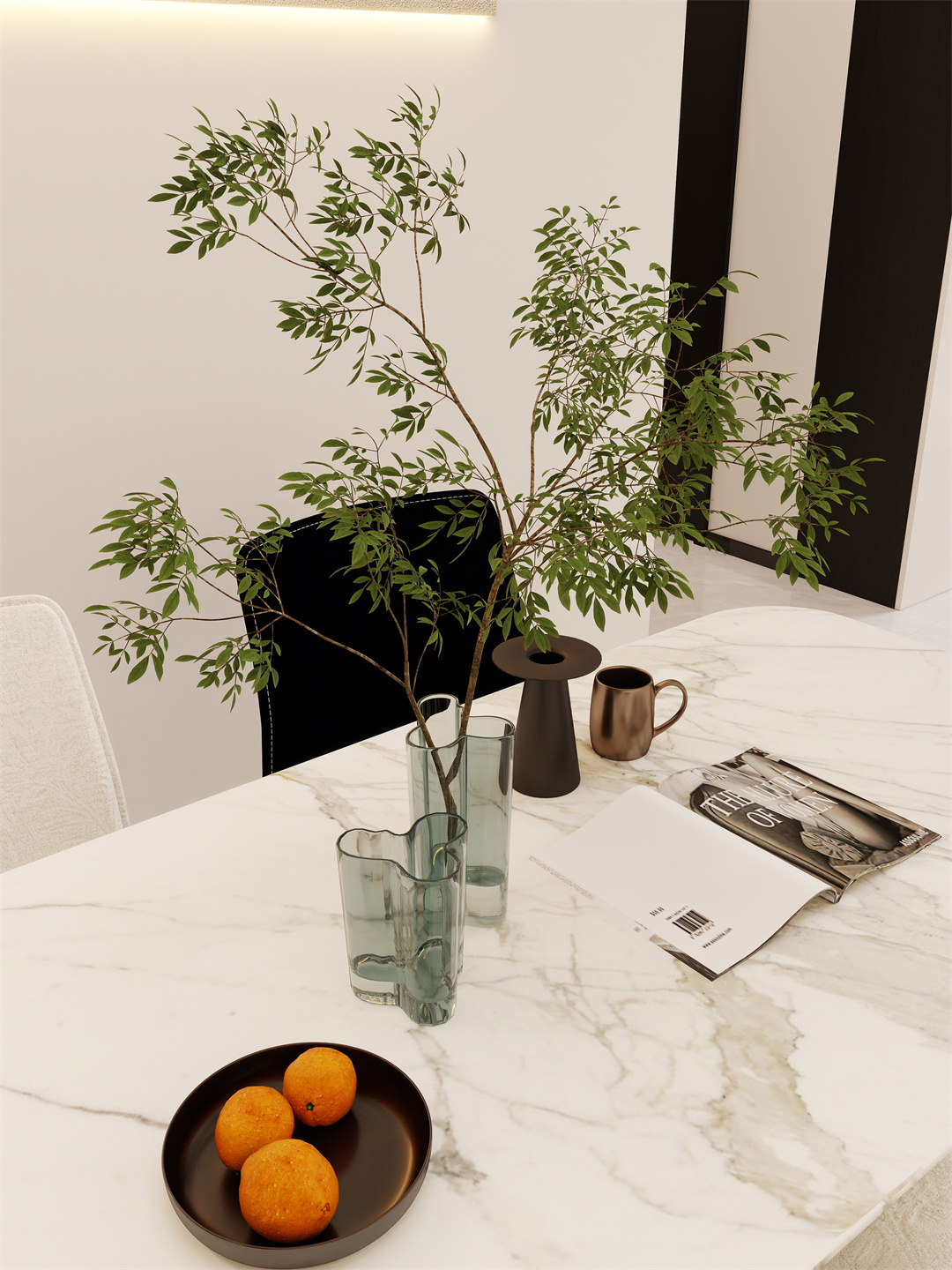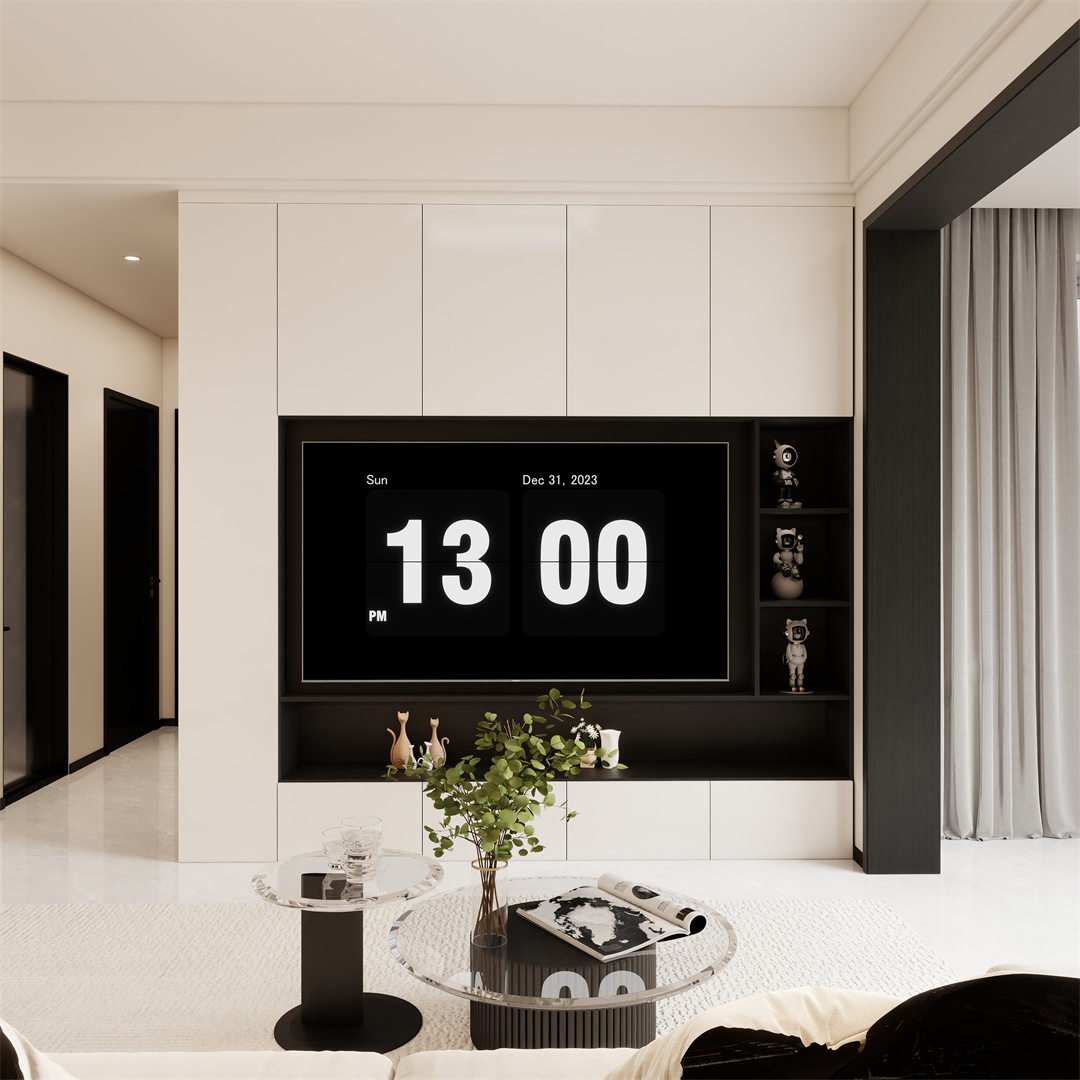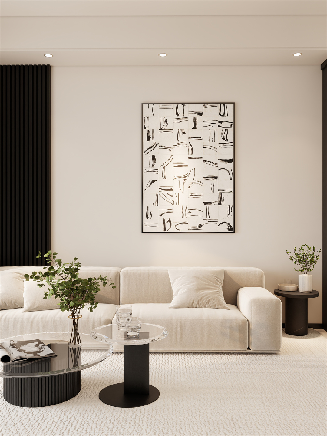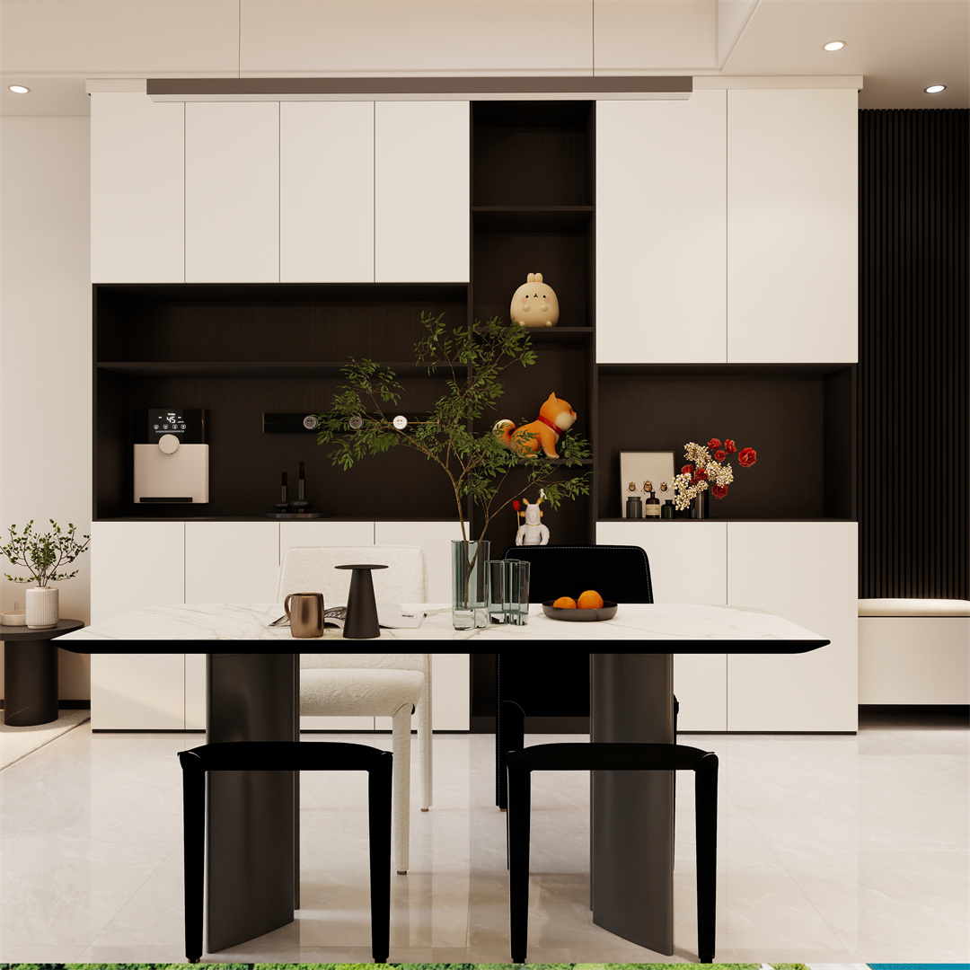 • 色彩上以黑白為主調,簡潔大氣。白色柜體延伸視覺,提供充足收納空間,黑色開放式格架形成對比,既豐富層次,又方便展示與拿取物品
