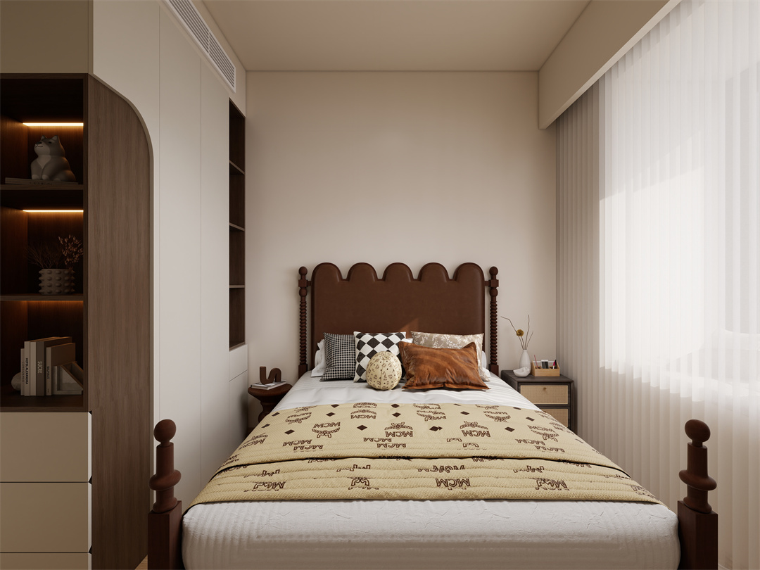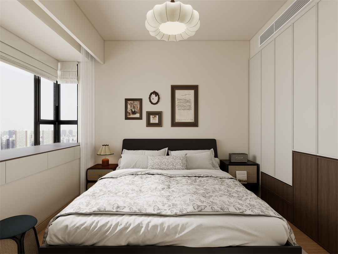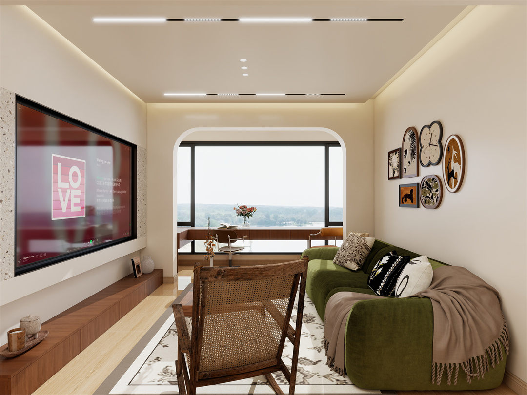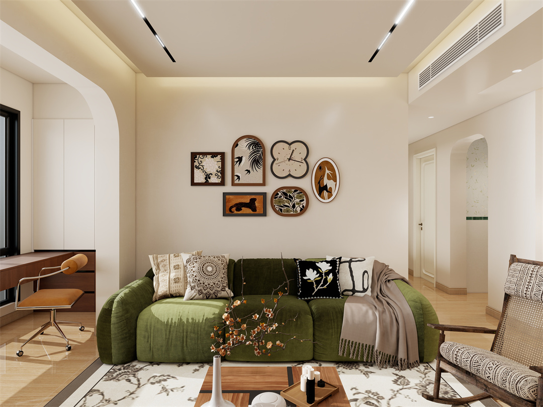 • 在客廳,整體色調柔和,米白色墻面作為基底,奠定溫馨基調。家具選擇上,墨綠色絨面沙發成為視覺焦點,復古質感與色彩張力十足,搭配帶有編織元素的木質座椅,傳遞出自然質樸的中古韻味。墻面裝飾畫造型多樣、風格復古,與整體氛圍相得益彰,豐富了空間視覺層次。地面鋪設帶有花紋的地毯,進一步強化復古氛圍,同時也為空間增添了一份柔軟觸感。大尺寸投影替代傳統電視,既契合中古風的休閑松弛感,又能滿足現代觀影需求,搭配簡潔的木質置物臺,實用與美觀兼具。