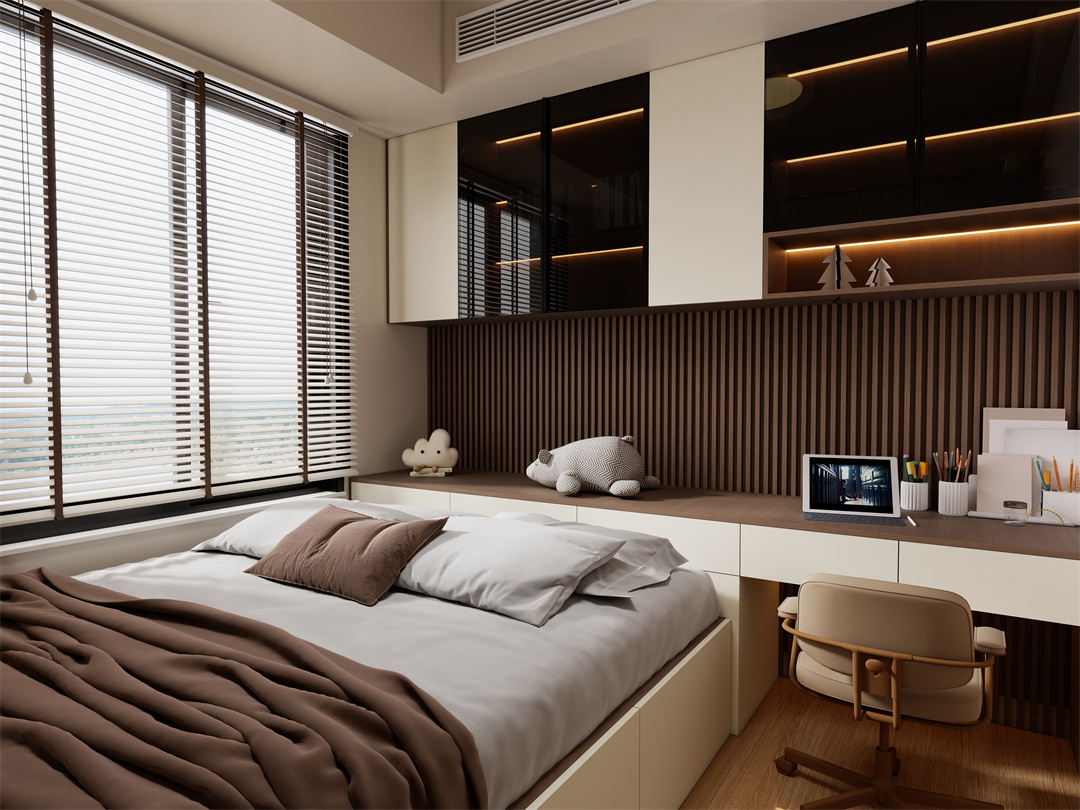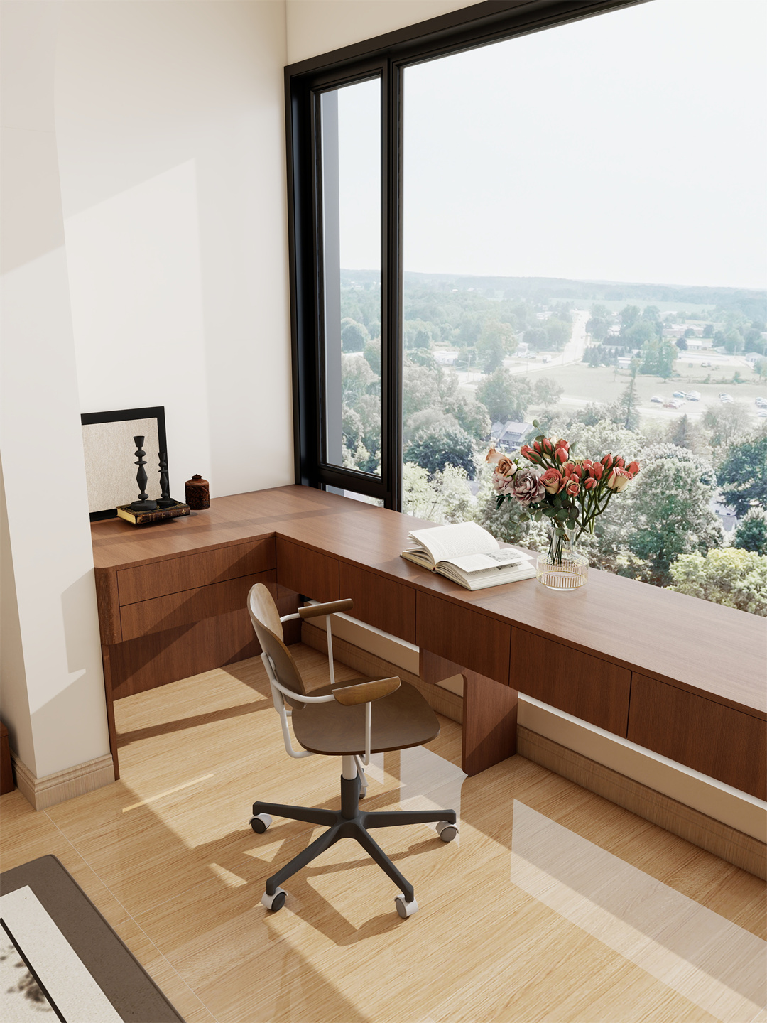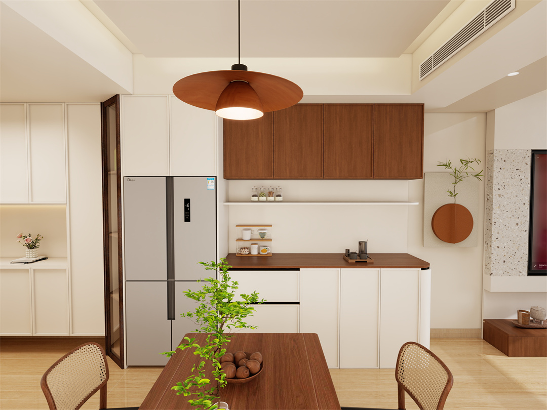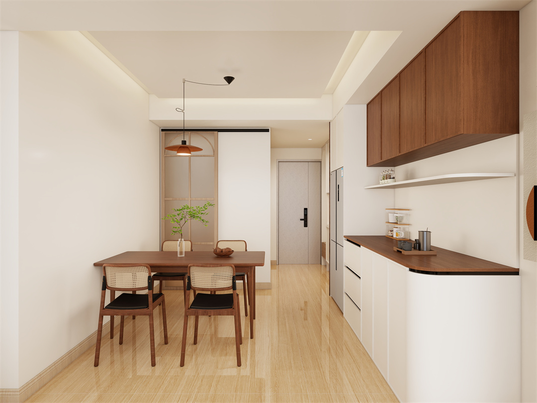 • 在客廳,整體色調柔和,米白色墻面作為基底,奠定溫馨基調。家具選擇上,墨綠色絨面沙發成為視覺焦點,復古質感與色彩張力十足,搭配帶有編織元素的木質座椅,傳遞出自然質樸的中古韻味。墻面裝飾畫造型多樣、風格復古,與整體氛圍相得益彰,豐富了空間視覺層次。地面鋪設帶有花紋的地毯,進一步強化復古氛圍,同時也為空間增添了一份柔軟觸感。大尺寸投影替代傳統電視,既契合中古風的休閑松弛感,又能滿足現代觀影需求,搭配簡潔的木質置物臺,實用與美觀兼具。